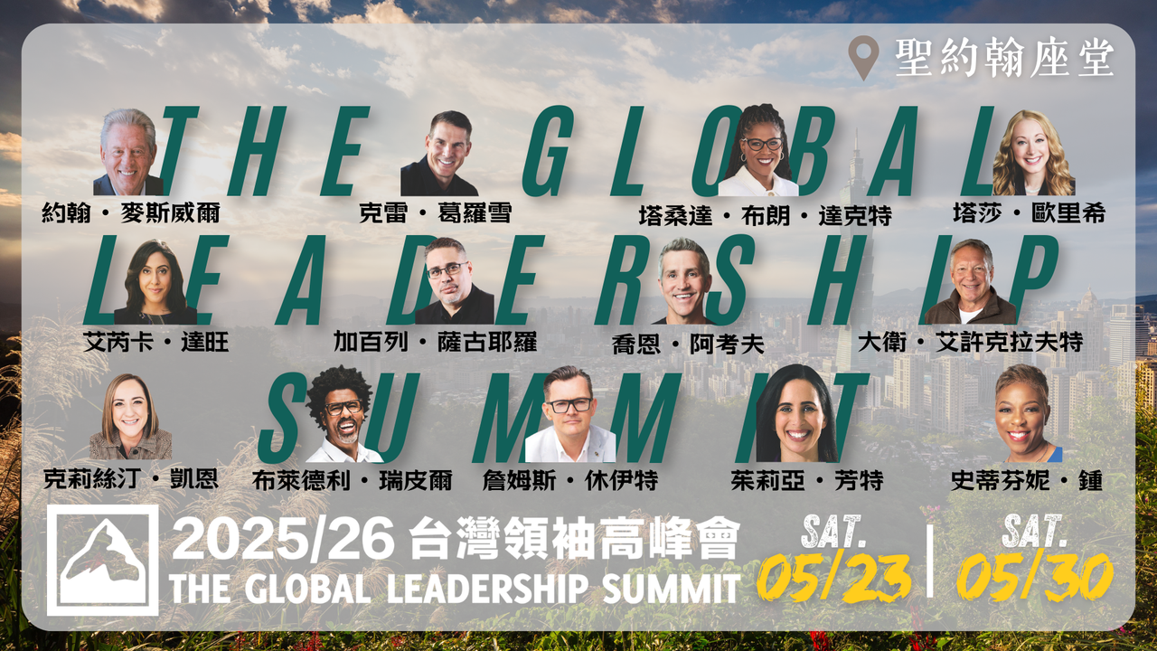 2025/26全球領袖高峰會將於8月7~8日,在美國芝加哥舉行。除了現場外,也將透過衛星直播傳送到美國與加拿大400多個聚會點。隨後並翻譯成55種語言,在110個國家超過1,400個城市舉行。全球預計將有400,000人參與,一同從世界一流的領袖、頂尖學者、領導力大師、職人、牧師們,獲得豐富的領導力見解,為您的領導力提供裝備與激勵。